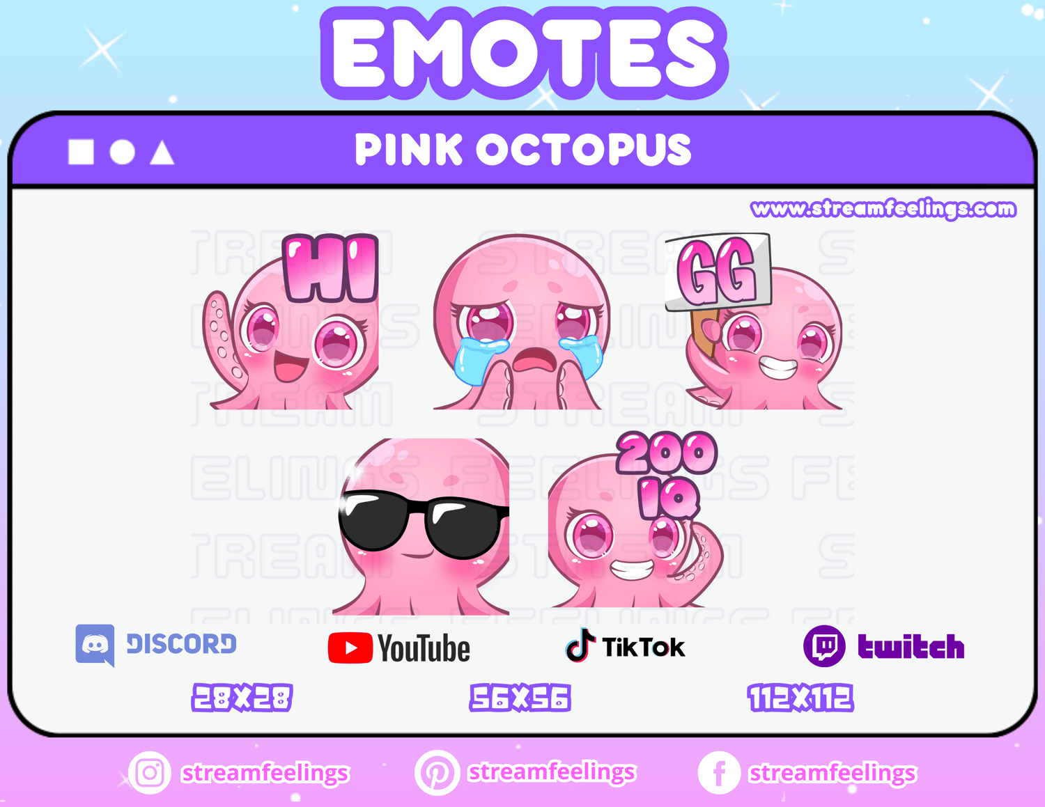 This digital file listing includes 5 emotes in 3 sizes (112x112, 56x56, and 28x28 px) in a zip folder, ready for you to personalize your channel.
