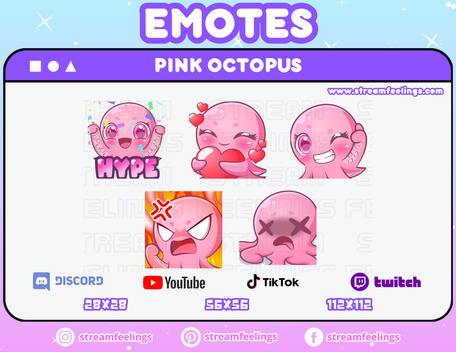 This digital file listing includes 5 emotes in 3 sizes (112x112, 56x56, and 28x28 px) in a zip folder, ready for you to personalize your channel.