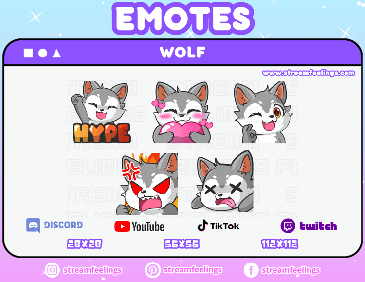 This digital file listing includes 5 emotes in 3 sizes (112x112, 56x56, and 28x28 px) in a zip folder, ready for you to personalize your channel.